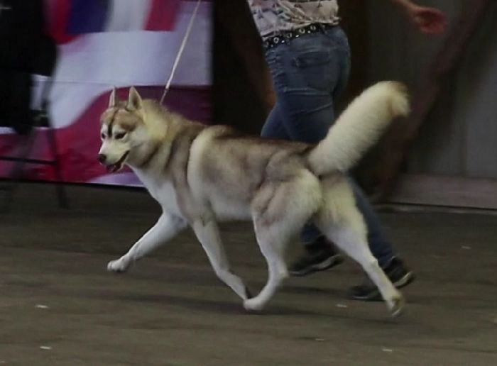 Tête masculine, bon stop; Oreilles moyennes bien portées. Oeil correct Bonne encolure le rein légèrement long Angulations correctes Pieds assez forts Beau port de fouet Peut encore maturer corporellement. Allures régulières avec bonnes amplitudes.
